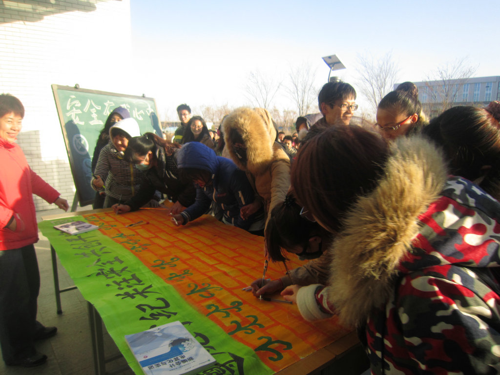 下午3点半,签名活动正式开展,在活动的现场,辅导员老师和近700名高职大学生纷纷在横幅上签下自己的名字,表达对安全问题的关注和支持。整个签名活动持续了近20分钟。