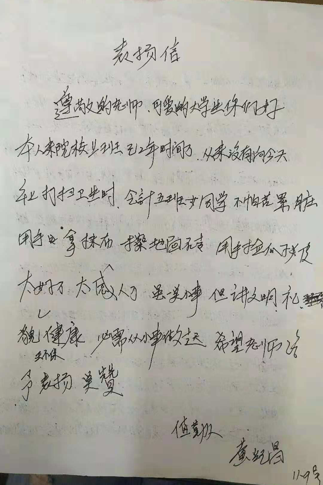 在11月9日,2018级会计5班的同学们也受到了表扬,同学们在值日的时候,不怕苦不怕累,用抹布擦洗地板,用手捡起地上的瓜子皮,这一吃苦耐劳的行为都被值勤人看在眼里,深为感动,写下了这封表扬信。