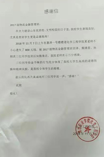 11月7日,我院2017级物流金融班宗泽、柴清荃、孙朝虎同学在惠泽一号楼楼道中捡到现金800元,面对“天上掉下来的馅饼”,几位同学没有丝毫犹豫,在第一时间将现金如数奉还给失主。以上三位同学的行为,表现出作为一名大学生拾金不昧的高尚品质和良好的道德情操,是我们学习的榜样。