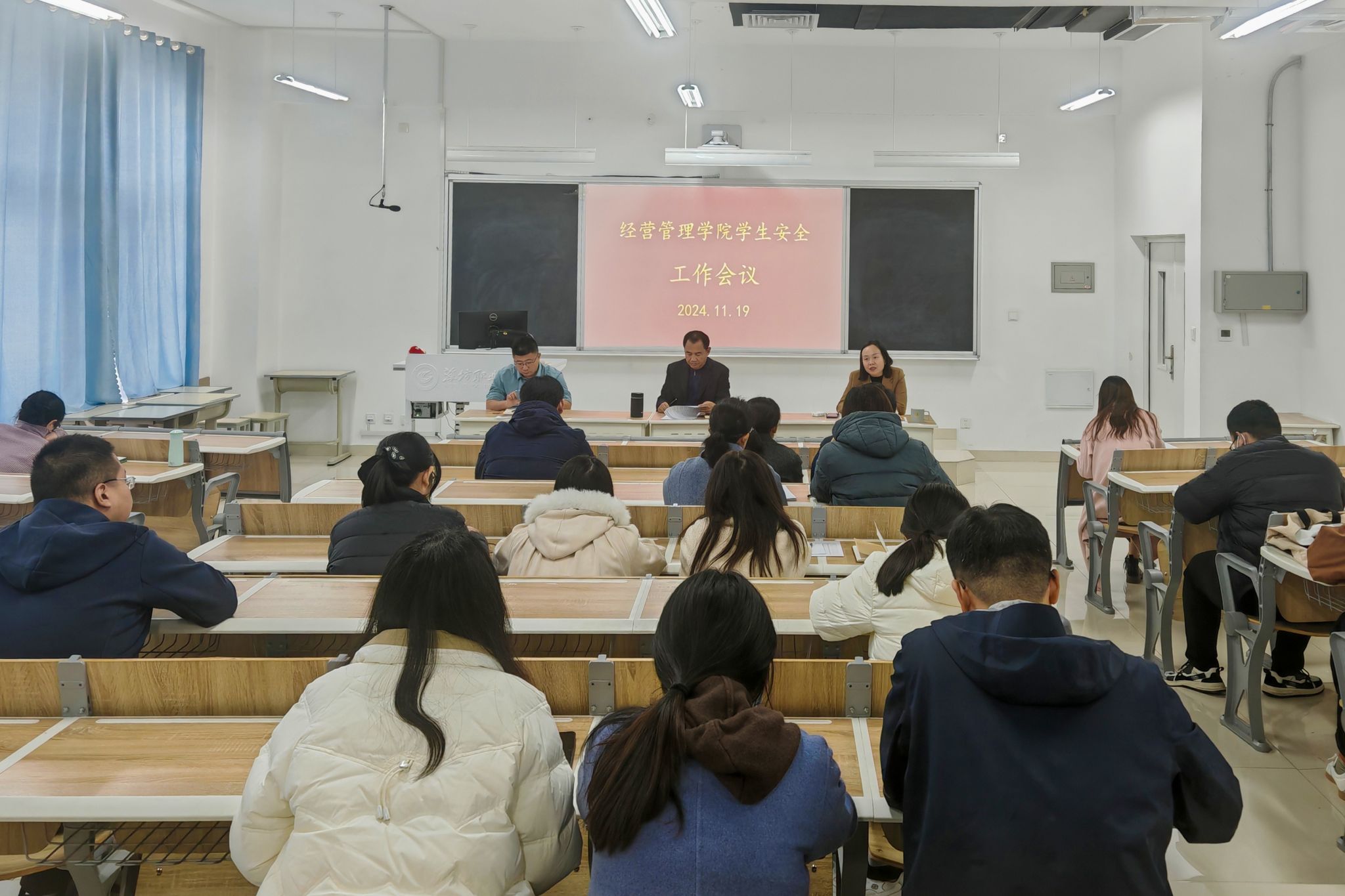 为扎实做好学生安全管理工作,全面提升辅导员安全责任意识,严格落实安全工作责任,11月19日下午,永利y23455在智泽2号楼B214教室召开了学生安全工作会议,我院主要负责同志、党总支负责同志、团总支负责同志和全体辅导员参加会议。