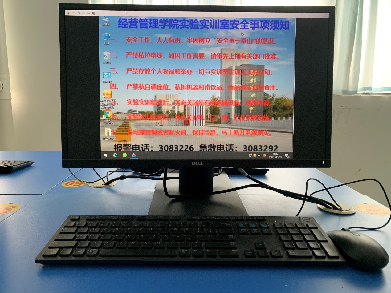 首先,实验实训室教师确保让学生在开展实训前掌握实训室安全知识,并对实验实训室设备操作安全注意事项进行认真讲解。为强化学生安全意识,实训室每台电脑桌面设有安全须知事项,让每位学生对安全问题得到更直观的认识。