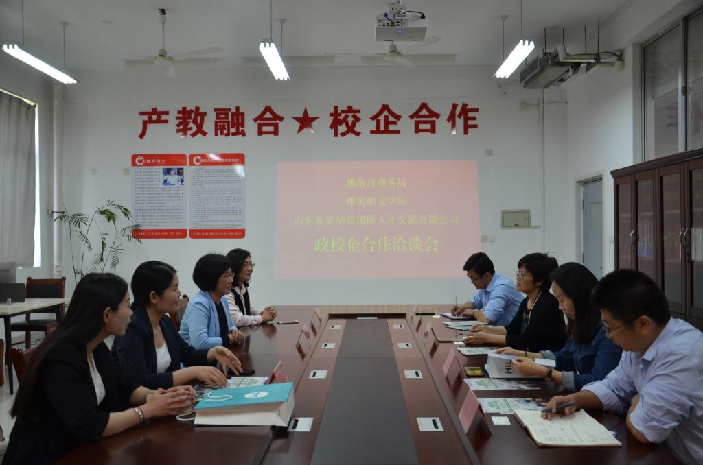 5月14日,潍坊市商务局与山东东昊华晨国际人才交流有限公司赴永利y23455洽谈学生海外实习就业有关事宜,永利y23455主要负责同志和产学合作负责同志进行了接待。