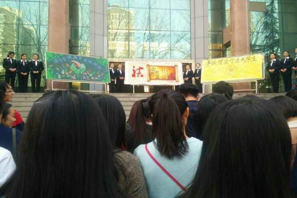 随后,辅导员老师、学生干部代表汇聚在16号楼东门门前,举行了 “懂法、守法”签字仪式。(李雪琳供稿)