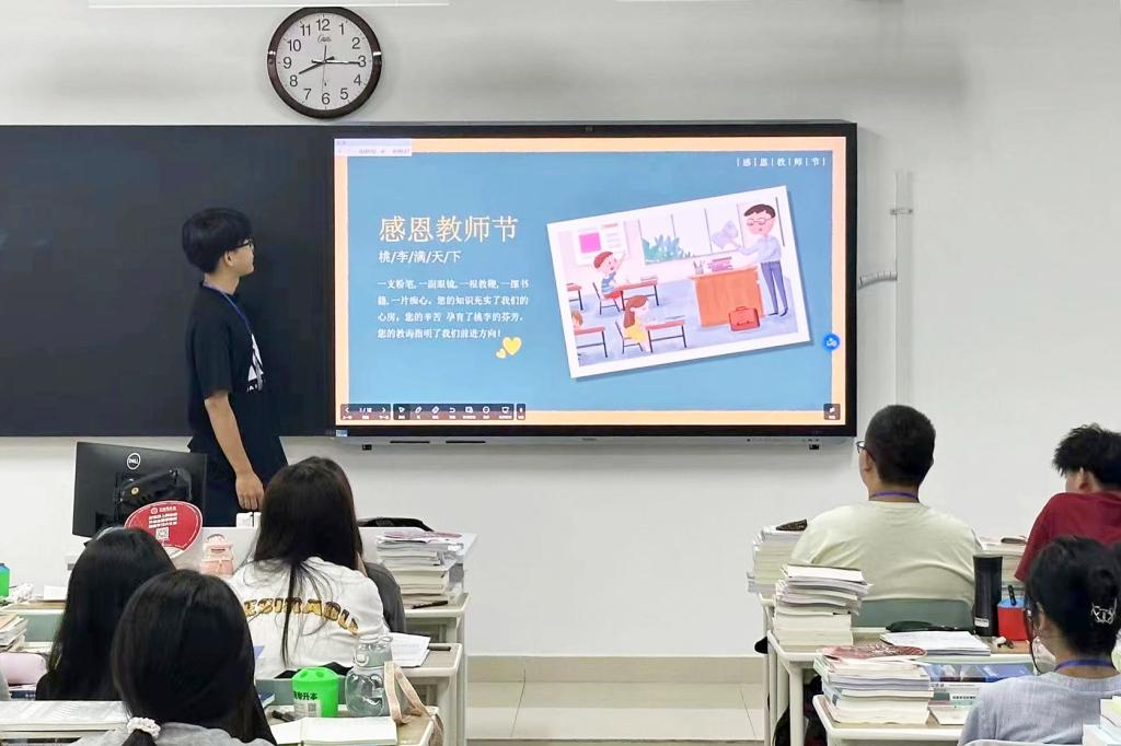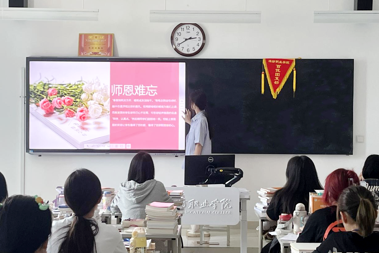 本次系列活动以召开感念师恩班会、团日活动等形式进行。各班团支书首先带领同学们观看时代楷模张桂梅先进事迹,让每个学生深入理解老师的辛苦,真正体会感悟到人民教师无私奉献的高尚师德,增强了学生的感念师恩之情。其次,组织同学们开展感恩教育,为上课教师送上一张贺卡、一声问候,使学生感恩老师的劳动、感恩老师的教诲,并通过诗歌朗诵、写感谢信、唱歌寄语等活动,加强师生之间的交流,增进师生的感情,抒发对老师的感恩之情,将“尊师、敬师、爱师”落实到行动上,创设了平等、愉悦的新型师生关系。