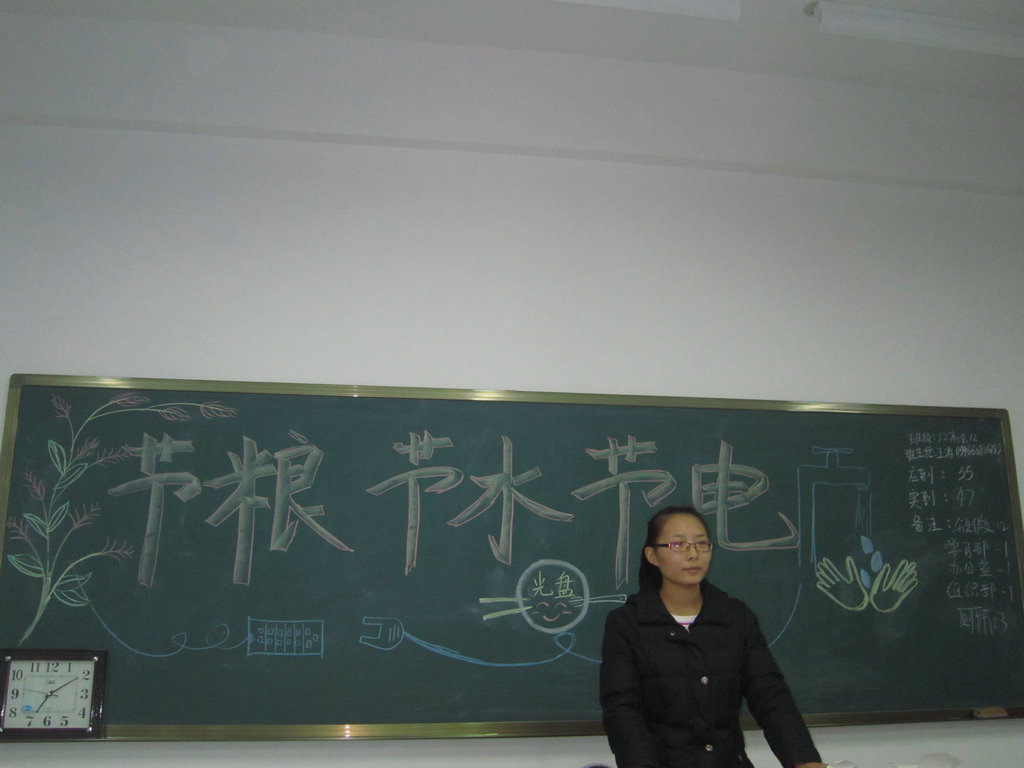 11月13日,“节粮、节水、节电”的醒目大字写在各个班的黑板上,而且每个班的板报也都更换成了以节约为题的内容。主题班会上,有的班级对班级的节约情况进行了总结,号召同学们要自觉养成节约的良好习惯,呼吁从一点一滴做起,在节约能源的同时,爱护环境,不挑吃、不挑穿、不浪费粮食;有的班级制定了“节能公约”;有的班级则通过演讲、唱歌、问答等形式表明要对自身的浪费现象进行纠正。
