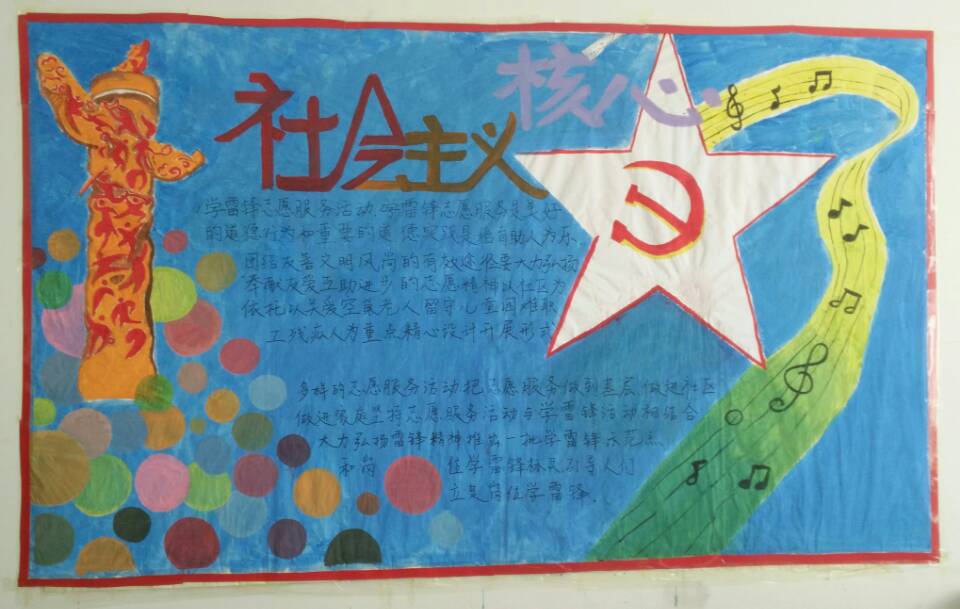 活动开始后,同学们积极参与,通过各种渠道搜集资料,选择内容,编排版式,用图文并茂的形式将墙报主题展现的淋漓尽致。有的班级以雷锋月弘扬雷锋精神为契机,内容设计将雷锋精神和大学生文明修身相结合,赋予雷锋精神丰富的时代内涵;有的班级通过写、剪、贴、画的形式展现“六有”大学生的内容,深刻理解“六有”的内涵和应肩负的时代责任;有的班级利用墙报适时引入“一学一做”教育实践活动具体要求,深刻领悟新时期合格团员的基本特征,督促同学们努力成为社会主义核心价值观的践行者和传播者,从而规范自己的言行举止。