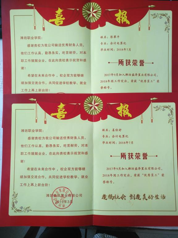 3月25日,山东盛泽置业有限公司送来喜报,永利y23455会计专业2名毕业生荣获山东盛泽置业有限公司2018年度 “优秀员工”荣誉称号。