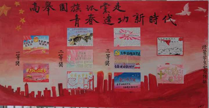 在活动开展过程中,同学们热情高涨,巧妙构思、精心绘制,充分发挥自己的想象力,创作出一幅又一幅令人眼前一亮的手抄报,红黄色的主色调背景,是青春激情的展现,迎风招展的五星红旗,是青春力量的化身,每张手抄报都承载着同学们对未来的期望、对自身的鞭策以及对青春的诠释。最终,活动评选出一等奖2名,二等奖3名,三等奖5名,以资鼓励。