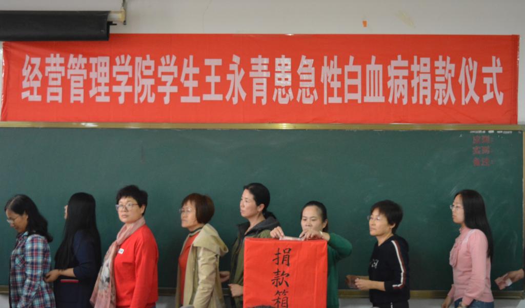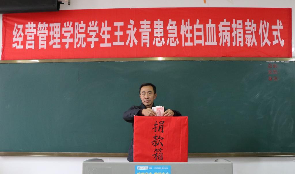 捐款仪式由学院和党支部主要负责同志主持,党支部主要负责同志表示,扶危济困,尊师爱生是每位教师的天职,王永青同学身患重病,急需救治,大家伸出援手,助力希望。随后,辅导员(团总支)办公室主要负责同志对王永青同学的病情进行详细介绍,呼吁大家积极捐款。接下来,老师们纷纷慷慨解囊,依次把自己的爱心投入捐款箱并祈愿王永青同学早日康复。最后捐款仪式在爱意浓浓,暖流涌动中结束。