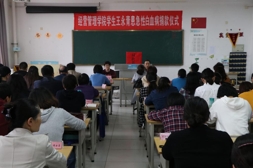 2019年10月24日下午,永利y23455在惠泽1号楼312教室举行了“为患急性白血病王永青同学”捐款仪式。永利y23455全体教师参加了仪式。用拳拳爱心为王永青同学托起生命的希望,让爱的种子在校园里生根发芽。