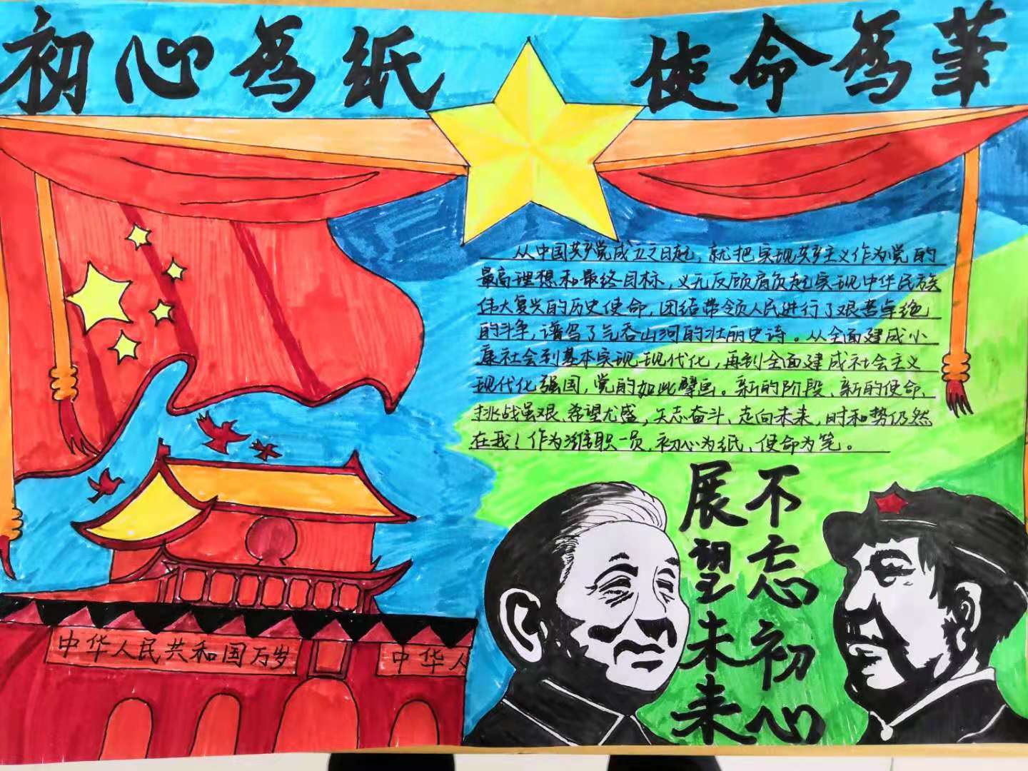 通过本次手抄报比赛,不仅让同学们体会到创作的乐趣,更是让十九大精神在大家心中扎根,引导同学们不忘初心、牢记使命,高举中国特色社会主义伟大旗帜,为实现中华民族伟大复兴的中国梦而不懈努力奋斗,共绘祖国繁荣富强锦绣画卷!(张叶斐供稿)