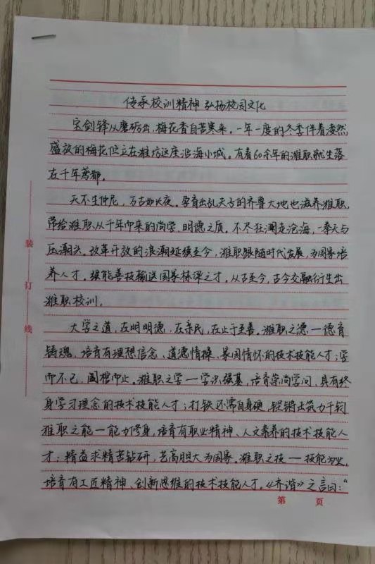 同学们坚持原创原则,紧扣传承和弘扬主题,严格遵守写作要求,表达了自己对社会主义文化、潍职文化的认同和自信,充满了青春活力和积极向上的昂扬状态。同学们在文章中表达了对我校六十余年办学历史的自豪和对“明德尚学强能善技”校训的传承,“崇实尚行”的文化理念及“敢于争先”的潍职精神生生不息。