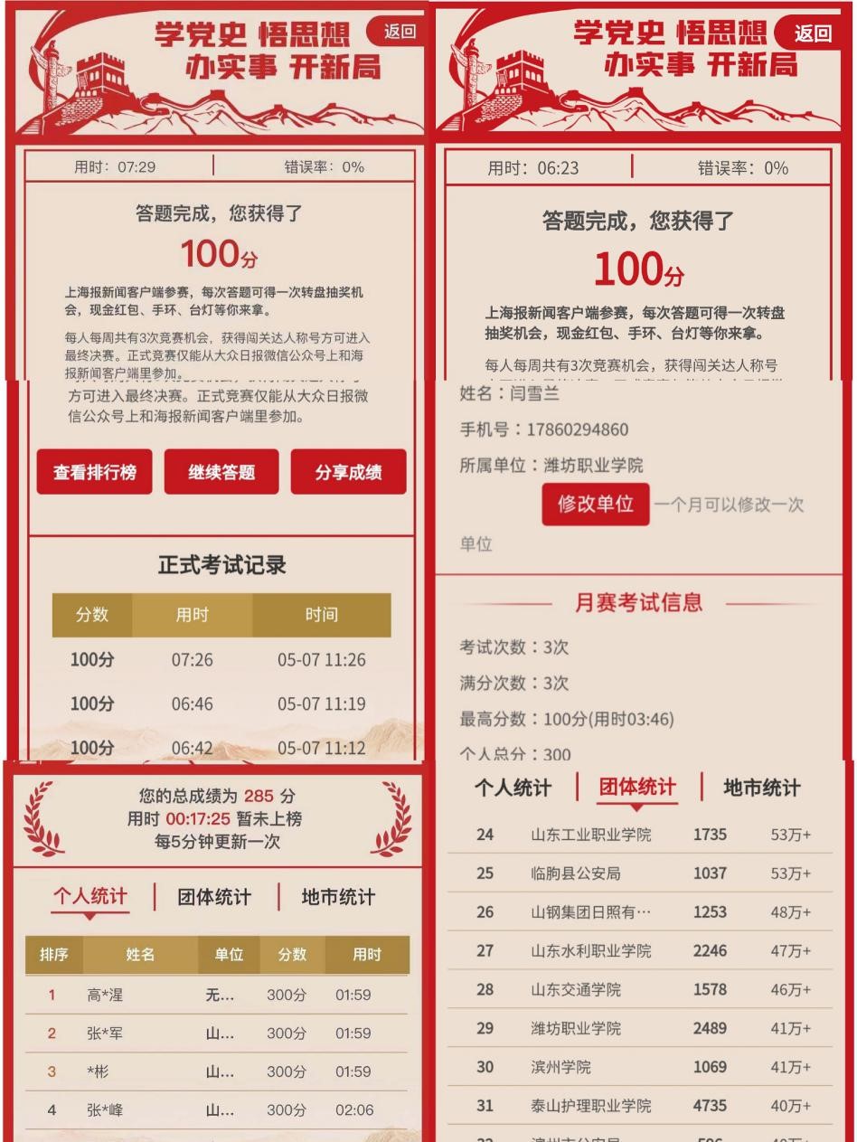 学党史知党情,悟思想强信念。通过参与党史学习教育知识竞答,广大师生纷纷表示,更加全面的提高了对党的认识和了解,增强了党性修养以及新时代下的责任感和使命感,在今后的学习工作中将继续学习党史知识,做到“学史明理、学史增信、学史崇德、学史力行”。(李婷杨柳供稿)