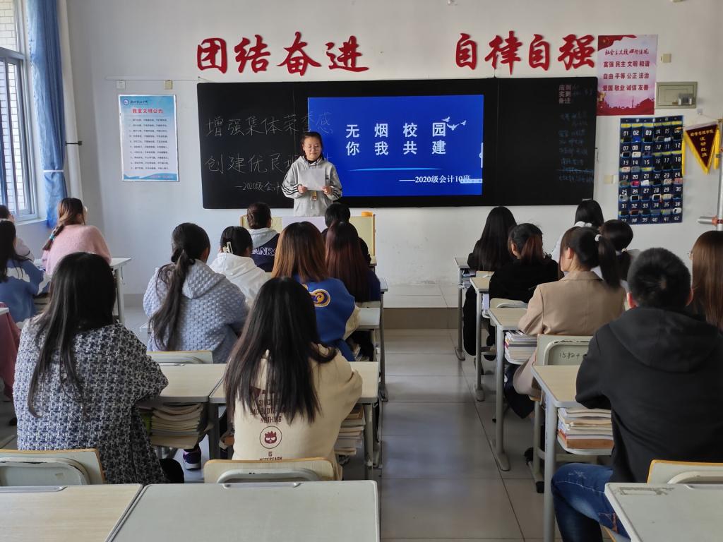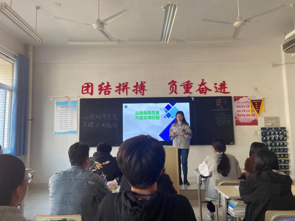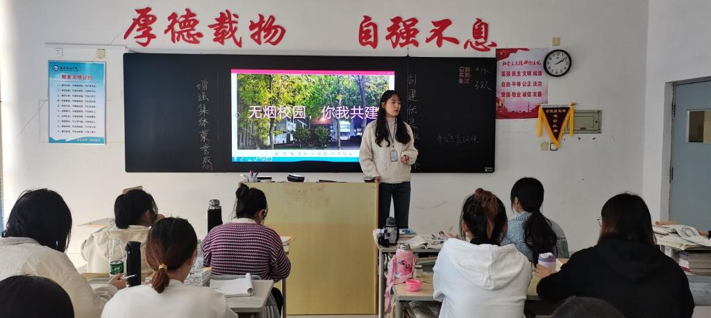 活动期间,各班级负责人组织开展了禁烟宣传主题团课,围绕人身健康、大学生文明礼仪、校园安全等方面,通过PPT展示真实数据和案例,对同学们进行了控烟知识宣传以及乱扔烟头存在安全隐患的教育,倡导同学们共建无烟校园环境。