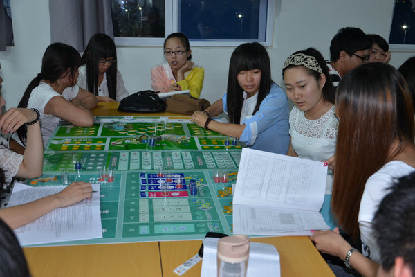 首先进行的是ERP企业经营管理沙盘推演培训。该培训以仿真的企业经营管理环境和运营操作流程为主线,通过学生模拟实践使学生置身于一个仿真企业的经营环境中,运用独特、直观的教具使学生亲自参与企业经营管理,让参与者理解市场导向基础上的营销管理与财务管理,认识各种决策与投资策略的市场效果,体验各个管理岗位的感受,理解公司任何一个部门的行为对公司全局的影响,了解资金在公司内如何流动,以及资金分配的重要原则,学习如何控制成本,培养统观全局的能力,学习提高自我的管理能力。