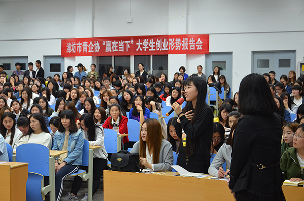 4月16日,由永利y23455和潍坊市青年企业家协会联合主办的“赢在天下”大学生就业创业形势报告会在滨海校区举行。报告会邀请潍坊星火学创、星火猎聘、山东甄才C8HR等公司的知名企业家主讲。