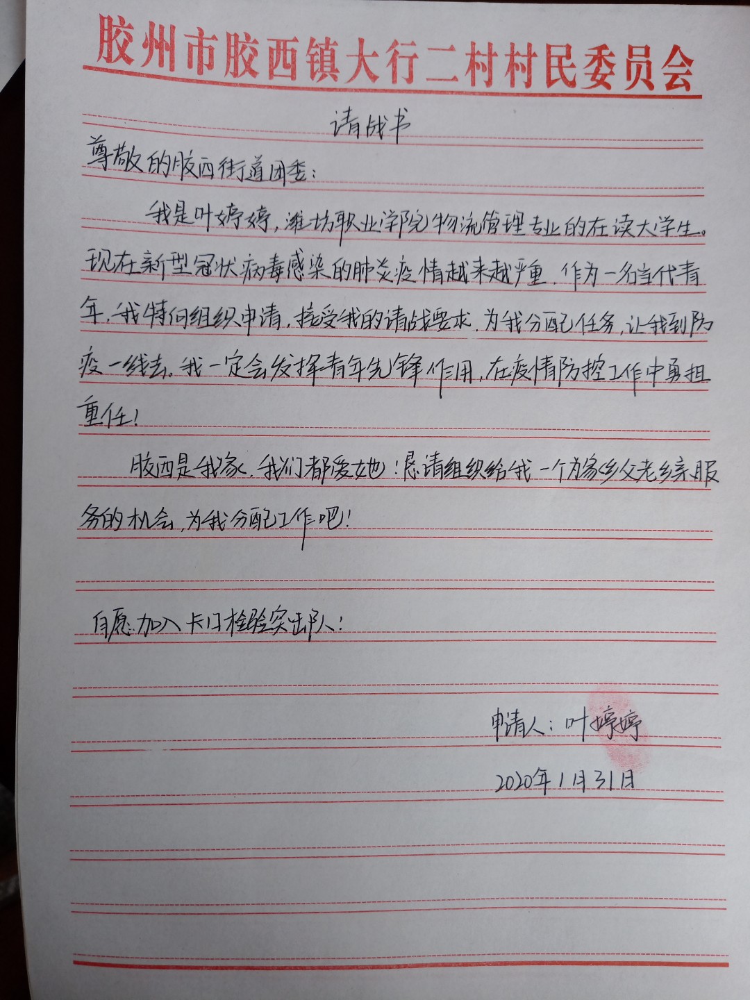 在这样一支庞大的志愿者队伍里,也有很多潍职经管青年的身影。有一分热,发一分光,远在各地的潍职经管人用不同的方式在此次抗疫行动中留下了爱与温暖,来自永利y234552018级物流管理1班叶婷婷同学就是其中的一员,1月31日她主动请战参加防疫工作,到村委会填写请战书,参加防控工作后,她每天在防控执勤点协助工作人员进行必要的信息登记和检测体温。他每天巡查村庄,对孤寡老人讲解疫情的相关知识,耐心做好小区人员的思想工作,告知在家隔离的必要性。对于有重要事情要外出的人员,她会反复叮嘱注意事项。“哪里需要,我就去哪里”在防疫工作中这是她的常态。她用自己的行动与责任感为抗疫行动贡献了自己的力量。
